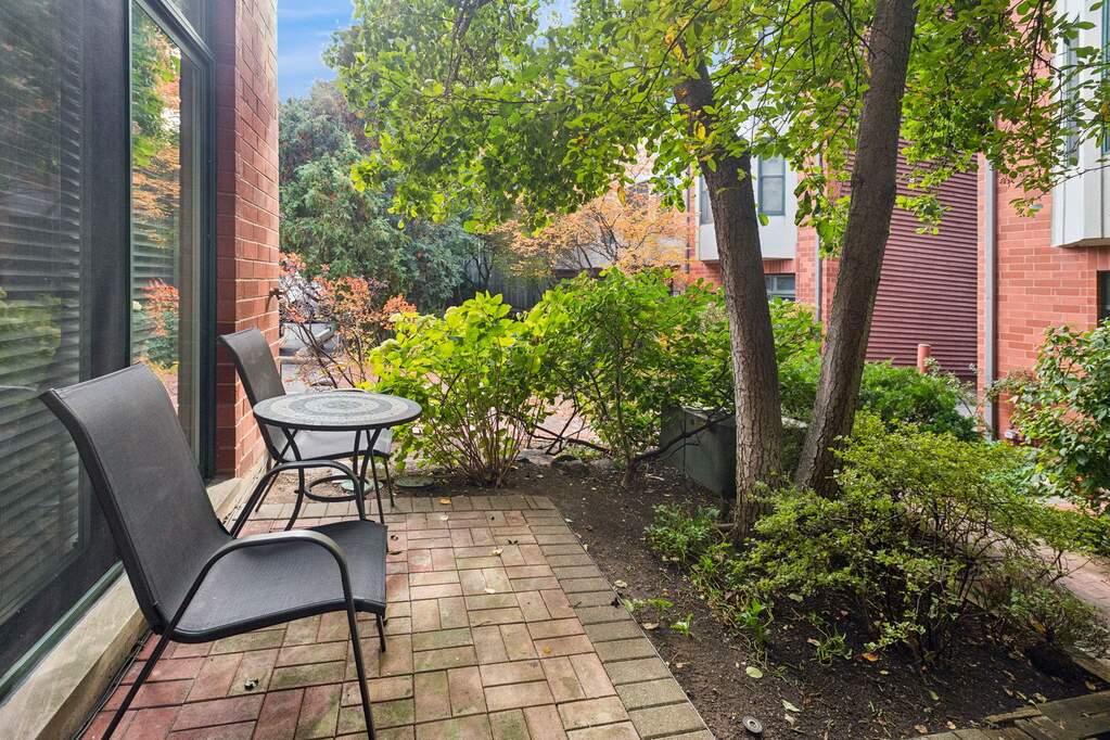 Front patio, private brick patio off living room, deck off second-floor bedroom, and shared landscaped courtyard with mature trees. This is the indoor-outdoor flow apartment life can’t match.